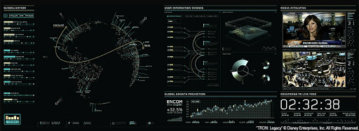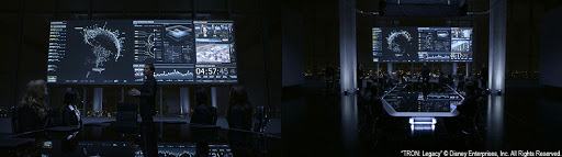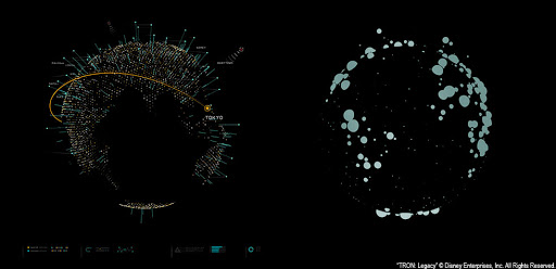 HexVirus is a spherical map of the globe that features vector outlines of the continents. These continent vectors are slowly eaten away by a more hexagonal representation. Algorithmically, this is a path stepping function which looks ahead for the closest matching 60-degree turns. The HexVirus globe was used in the executive board meeting scene, and also inside the grid as a visual aid in CLU's maniacal plan presentation. In the board room interface, the globe element is surrounded by the lovely work of my team.