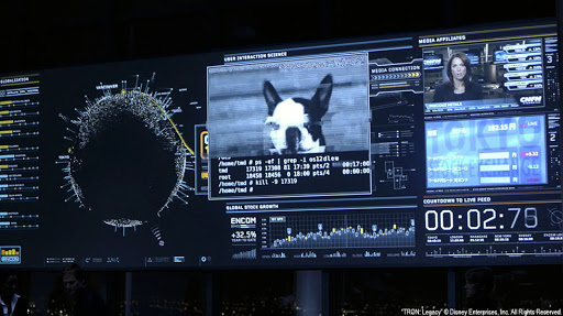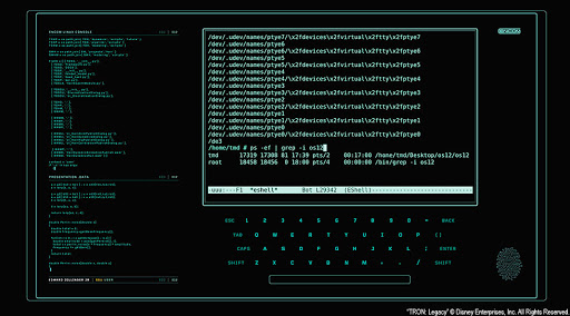 In addition to visual effects, I was asked to record myself using a unix terminal doing technologically feasible things. I took extra care in babysitting the elements through to final composite to ensure that the content would not be artistically altered beyond that feasibility. I take representing digital culture in film very seriously in lieu of having grown up in a world of very badly researched user interface greeble. I cringed during the part in Hackers (1995) when a screen saver with extruded "equations" is used to signify that the hacker has reached some sort of neural flow or ambiguous destination. I cringed for Swordfish and Jurassic Park as well. I cheered when Trinity in The Matrix used nmap and ssh (and so did you). Then I cringed again when I saw that inevitably, Hollywood had decided that nmap was the thing to use for all its hacker scenes (see Bourne Ultimatum, Die Hard 4, Girl with Dragon Tattoo, The Listening, 13: Game of Death, Battle Royale, Broken Saints, and on and on). In Tron, the hacker was not supposed to be snooping around on a network; he was supposed to kill a process. So we went with posix kill and also had him pipe ps into grep. I also ended up using emacs eshell to make the terminal more l33t. The team was delighted to see my emacs performance -- splitting the editor into nested panes and running different modes. I was tickled that I got emacs into a block buster movie. I actually do use emacs irl, and although I do not subscribe to alt.religion.emacs, I think that's all incredibly relevant to the world of Tron.