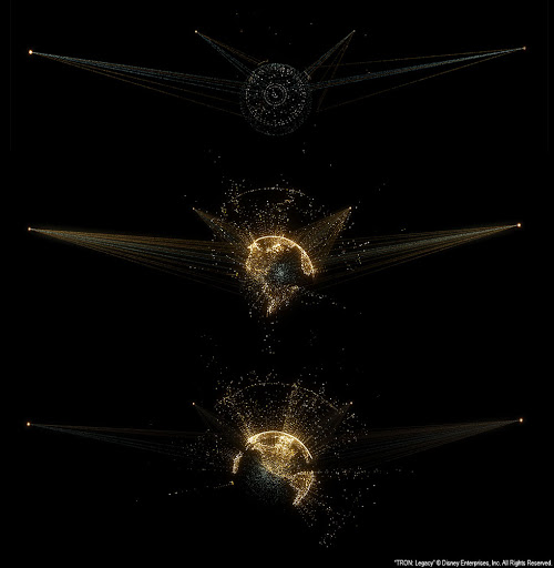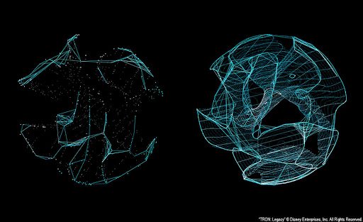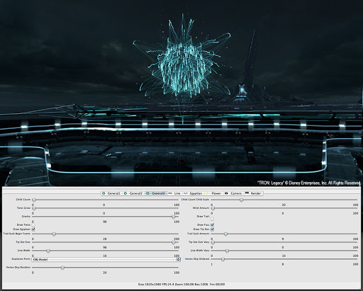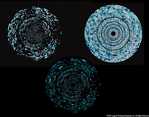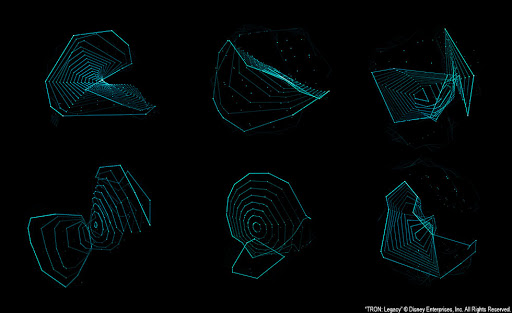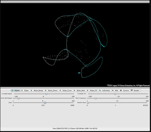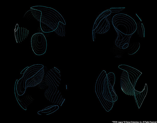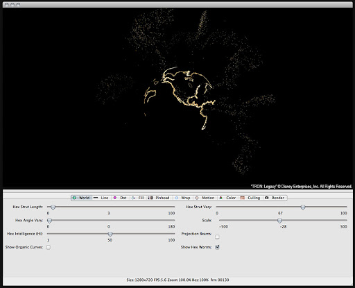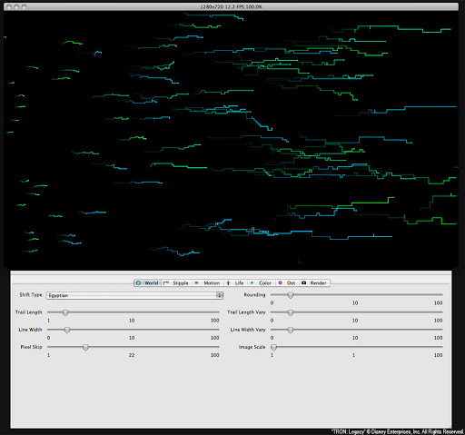 I spent a half year writing software art to generate special effects for Tron Legacy, working at Digital Domain with Bradley "GMUNK" Munkowitz, Jake Sargeant, and David "dlew" Lewandowski. This page has taken a long time to be published because I've had to await clearance. A lot of my team's work was done using Adobe software and Cinema 4D. The rest of it got written in C++ using OpenFrameworks and wxWidgets, the way I've always done it with this team ;) Uniquely however, Digital Domain's CG artists were able to port my apps over to Houdini for further evolution and better rendering than OpenGL could ever provide. Special thanks to Andy King for showing me that what seasoned CG artists do at DD is actually not so far off from what's going on in the Processing community.