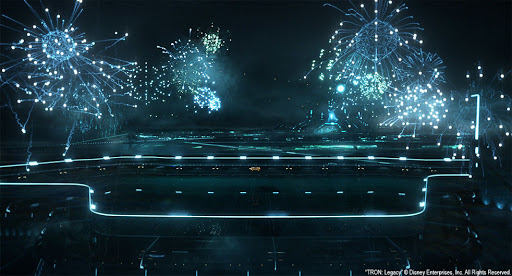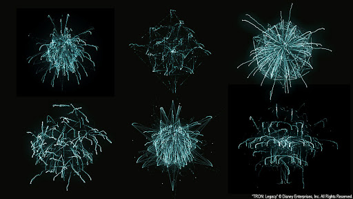 Fireworks, mmmm. I started with a regular physics simulation where a particle has an upward force applied at birth, sending it upward while gravity pulls it back down resulting in a parabola. I then added particle-children, followed by various artistic styles, including what our team has called "egyptian" across several jobs -- which is a side-stepping behavior. We were trying to create fireworks that looked enough like real fireworks but had interesting techno-aesthetic. As a homage to the original Tron character Bit, we used icosahedrons, dodecahedrons, and similar. I was disappointed that Bit isn't in this one. After doing this simulation, I've grown more aware of how often fireworks are used in movies.