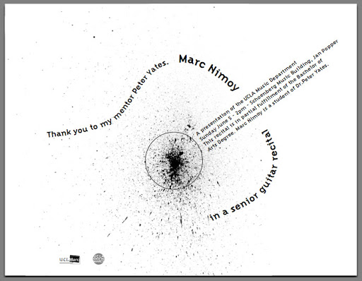 A programme designed for brother Marc's graduation from the UCLA music department. The graphics are intended to communicate the dissolving of the guitar into nothingness. The page folds vertically in half, bisecting the guitar's circular hole.