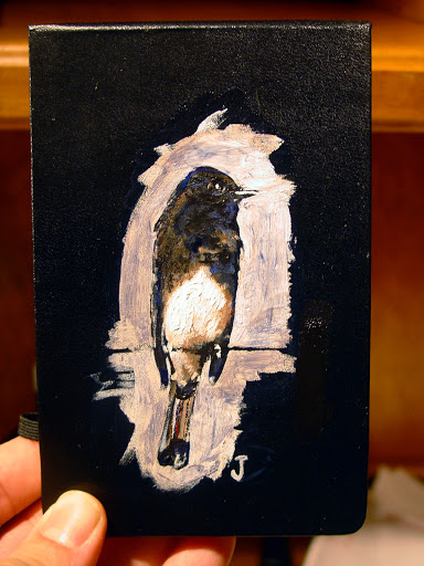 I painted a black phoebe onto a new sketchbook for my father's birthday.