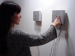 A single red pixel, networked between two wall hanging displays with embedded network circuits inside them. One controls the X movement while the other controls the Y movement.