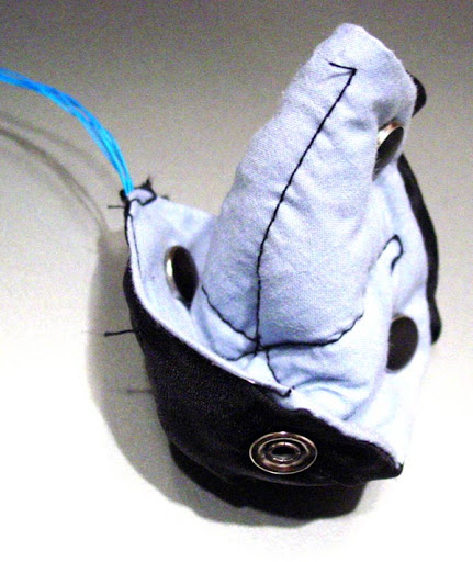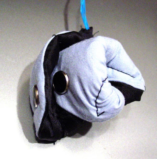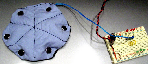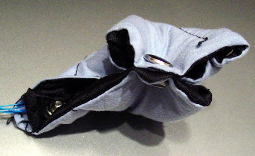 Physical Computing Week 2 Exploration: Make a switch. Here is a small, snap-ridden soft-sculpture which can be shaped and snapped as desired. When snaps are connected, a computer is able to notice which ones, and for how long. Asside obvious abstract-art implications of such a digitally aware object, a childrens origami toy can be designed (just for example) which provides reinforcing sensory material about what the child is exploring while snapping. If you form a dog shape, the object will bark. TODO: images need to be thumbnails. Remind me.