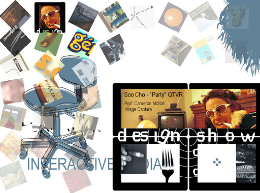 UCLA Undergraduate Design Exhibit's 2000 Interactive design kiosk for viewing student work. Thumbnails spin according to distance from mouse, graphics slide back and forth on screen, also responding to mouse. Cursor shrinks and grows to fit thumbnails.