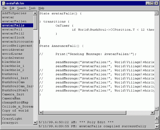 Poly Edit is a kind of development program I wrote in hopes to speed up the behavior scripting process for Rebecca Allen's Emergence project. This was also the first Help system the project had. The application is based around the emergent processes for creating reactive creatures in the 3D world. I hear they still use it.