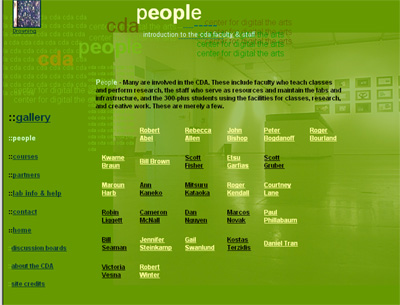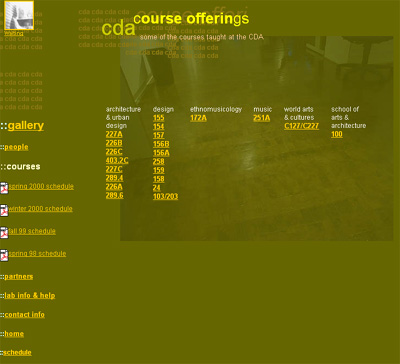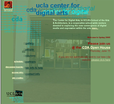 I redesigned the website for the Center for Digital Arts at UCLA, taking it from Mom & Pop to something local design students could look at. Pieces of my original layouts and graphics still remain in dark corners.