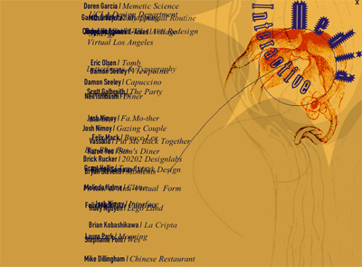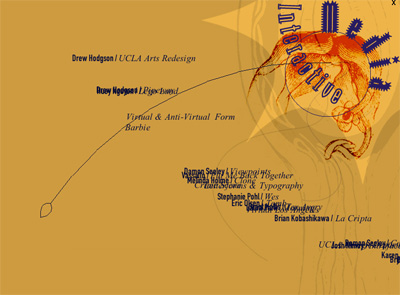 Interactive Kiosk for student work. A curving bud opens and closes while shy student titles react and play. Press Spacebar to trigger one of several kiosk-attraction modes.