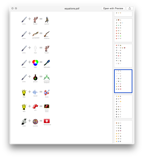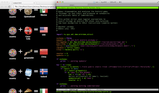 This was a piece begun in 2011 and finished then published at Art Hack Day in San Francisco, GAFFTA on December 13-15, 2012. Alchemy was my favorite game on Android. It asks the user to combine basic elements to produce more complex ones, beginning with earth, wind, fire, and water. Eventually, you can produce celebrities, individuals, nations, and abstract concepts. I saw cheat sheets online, but noticed none of them were exhaustive, and were probably being collected from individual trial and error. Knowing there would probably be a small percentage of connections not yet discovered, I set out to decompile the app and see what people had missed. Note, this version of the alchemy game is several versions of the software into the past. It's not a visualization of the one you can get from the Google Play store. This project is also not an attempt to steal intellectual property from its rightful owner. If you enjoy this game as much as I do, I encourage you to purchase a copy, and play it normally ;)