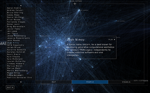 James George and Jonathan Minard co-directed an interactive documentary on the people in my scene. I was happy to be one of the interviewees and be one of the commissioned code artists. Here was the beta teaser on kickstarter: